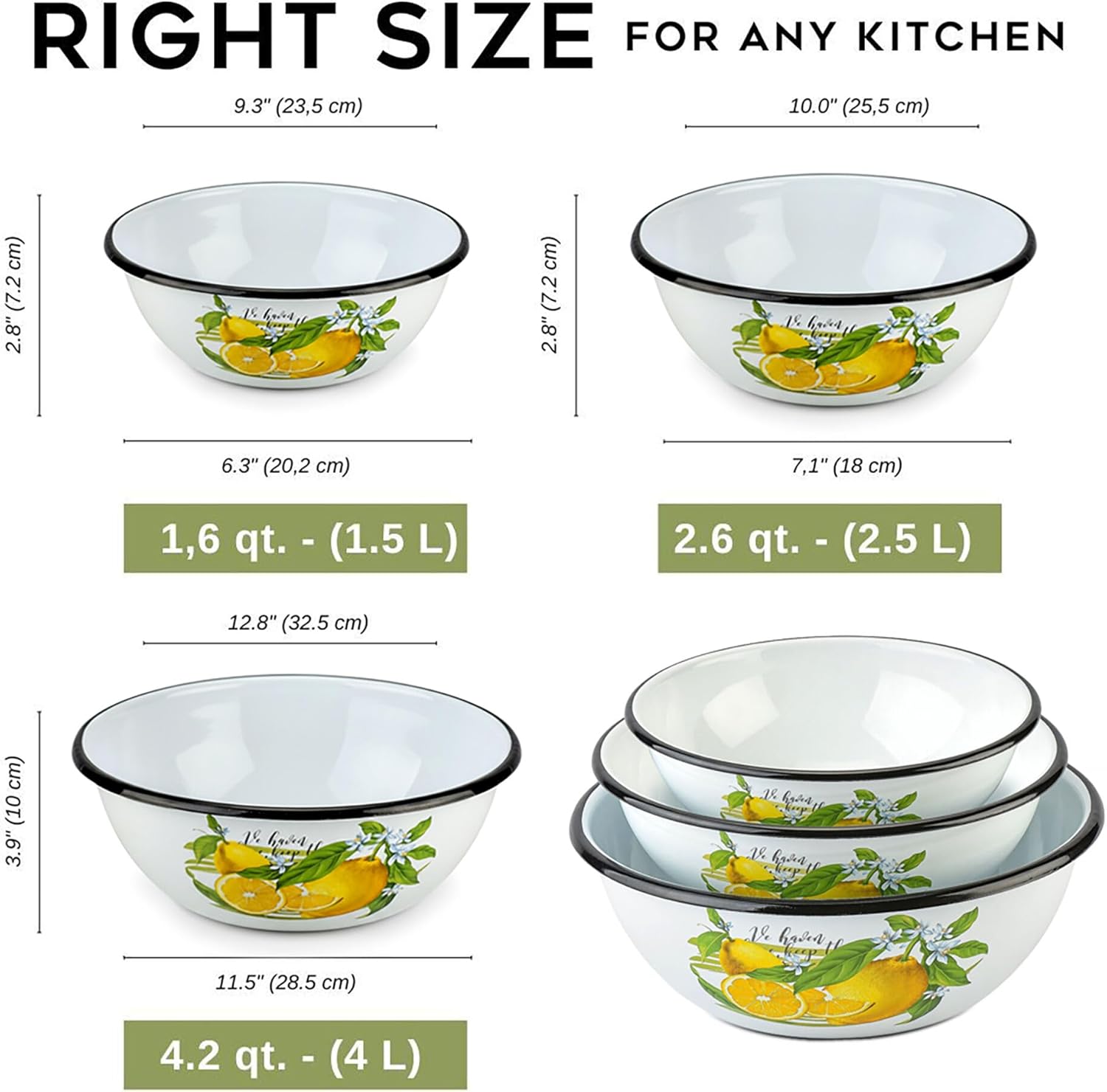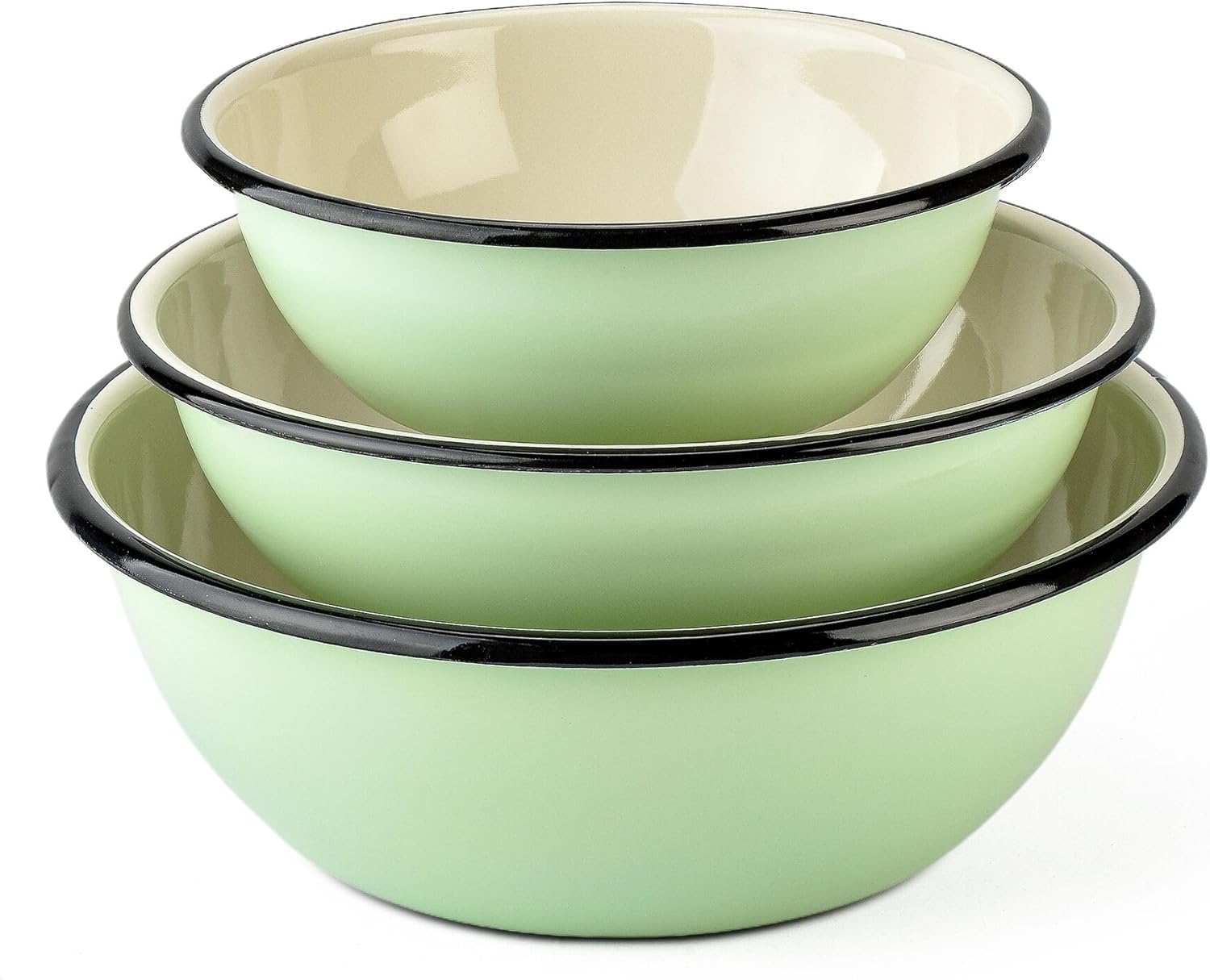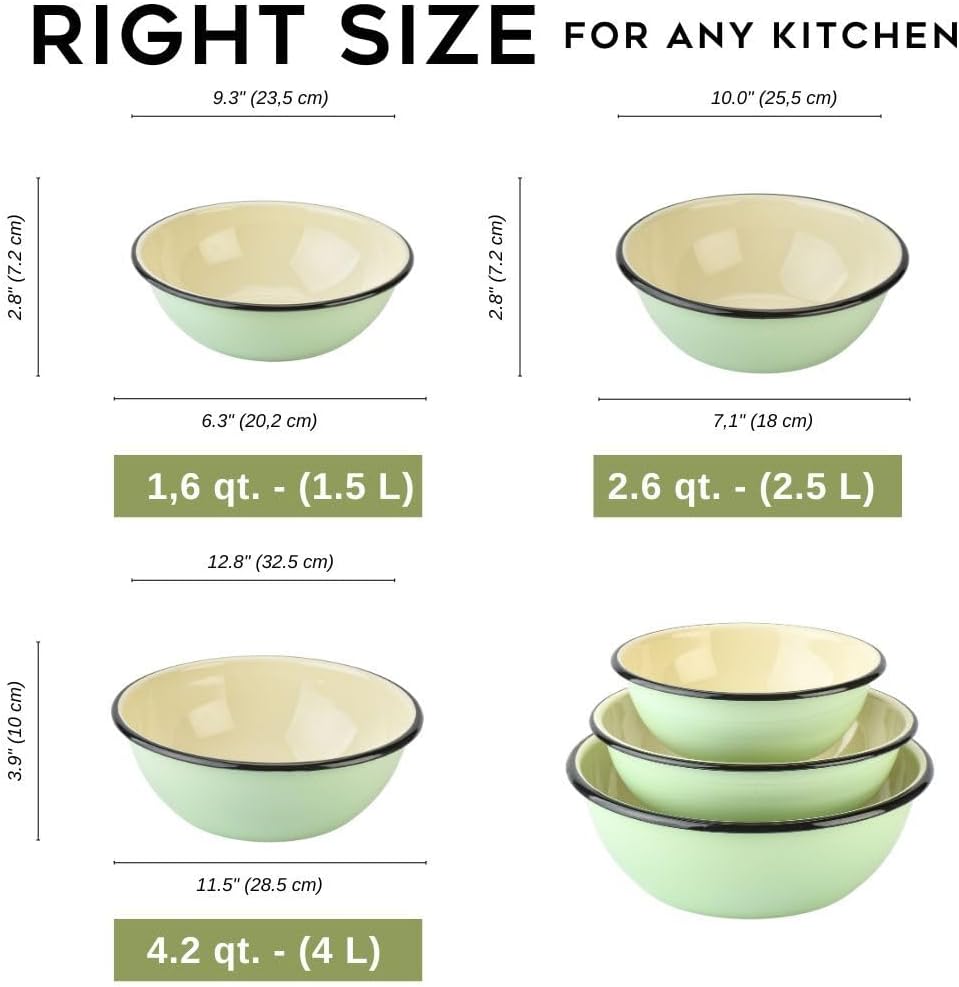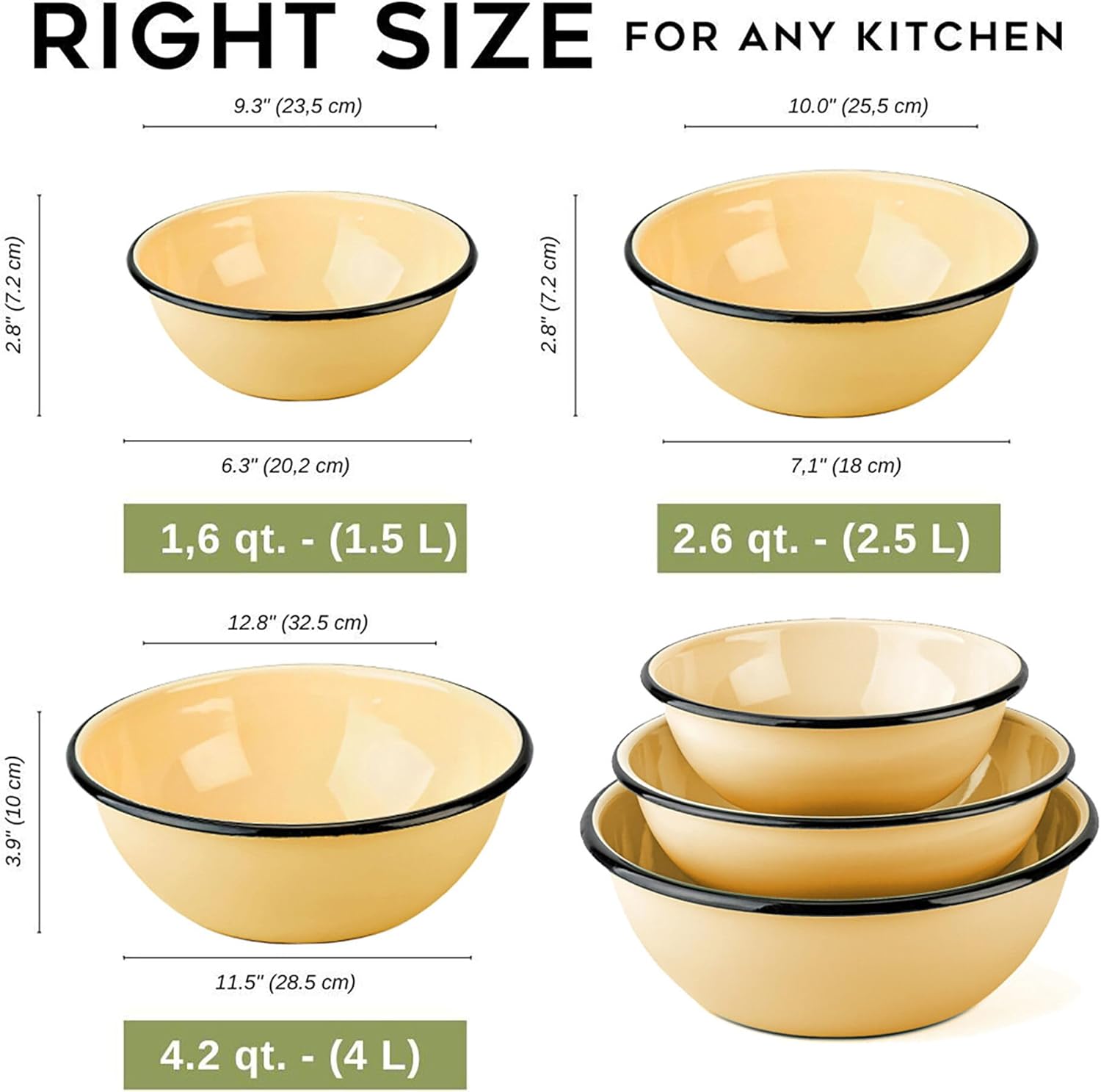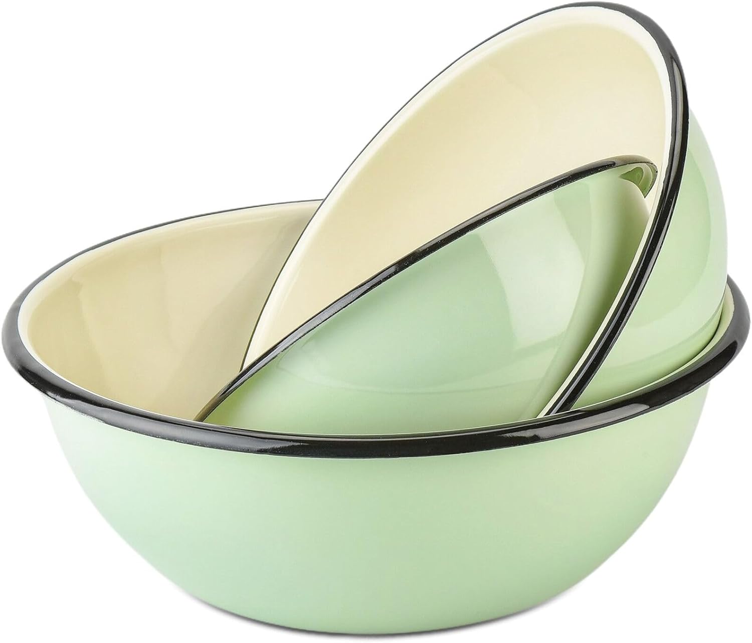 The Enamel Serving Bowl Set combines charm, durability, and versatility, making it a must-have for any kitchen or outdoor dining experience. Crafted from enameled steel, these bowls feature a vintage-inspired design that adds a touch of elegance to your table or picnic setting.The set includes three different capacities - 1.6 Qt (1.5 L), 2.7 Qt (2.5 L), and 4.2 Qt (4 L). Perfect for serving and mixing, the bowls are designed to handle a wide variety of dishes, from salads and pastas to desserts and snacks. Their sturdy construction ensures long-lasting use, while the smooth enamel coating preserves the flavor and freshness of your food.Whether used in a rustic country cabin, a cozy kitchen, or as part of an outdoor dining setup, these bowls are both functional and stylish. The enamel coating resists stains and odors, making cleanup a breeze. Their compatibility with all stove types adds even more utility, allowing you to use these bowls for cooking and serving in a seamless transition.These enamel bowls are dishwasher safe for easy cleaning. With proper care, they will retain their vibrant appearance and functionality for years to come, making them a reliable and attractive addition to your home.Enhance your dining and cooking experience with the Enamel Serving Bowl Set, a versatile and stylish solution for both everyday meals and special occasions.