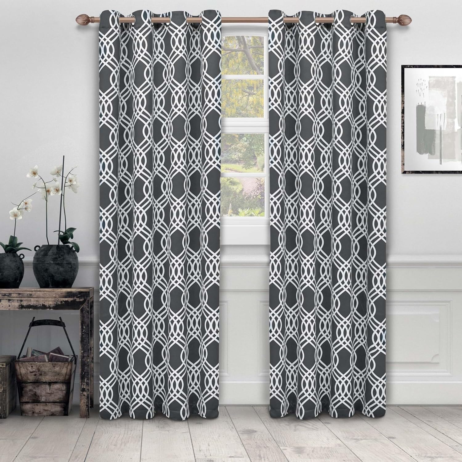 Transform your home decor with the Ribbon Room Darkening Blackout Curtains by Superior. Crafted from 100% polyester with a rod pocket or rust-free grommet header (depending on size), this panel set is durable and modern in design. Our blackout curtains block out 70-80% unwanted sunlight and UV rays, so you can feel cozy in your home. Perfect thermal insulators, each panel in this set reduces room heat and cold loss through your windows to help you save energy and maintain the ideal temperature. These curtain panels display a classic all-over trellis design giving you an elegant window accent with the comfort and convenience of sunblocking features.