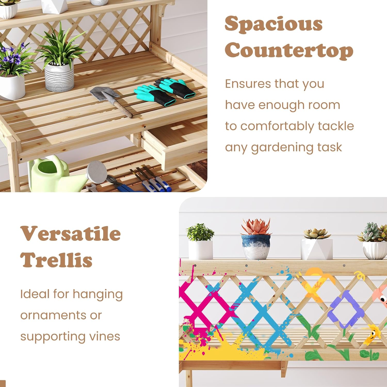 Plz find the reason why you can buy our Garden Potting Table. Made of solid fir wood with good wear and tear resistance. Multiple storage spaces with upper and lower shelves and drawer. Spacious countertop can be used to display plants or tackle gardening jobs. Feature: Metal drawer handle is durable and comfortable to use Perfect for use on terraces, gardens, balconies, verandas, etc. Bottom shelf with slatted design to prevent water accumulation Versatile trellis for climbing plants or hanging decorative ornaments Customisable surface to create your own unique garden potting table Specification: Color: Natural Net Weight: 9 kg Material: Fir Wood Tabletop Height: 60 cm Top Shelf Weight Capacity: 15 kg Tabletop Weight Capacity: 80 kg Tabletop Size: 83 x 57 cm (W x D) Storage Shelf Weight Capacity: 100 kg Drawer Size: 37 x 29 x 5.5 cm(D x W x H) Product Dimensions: 90 x 59 x 88 cm (L x W x H) Package Includes: 1 x Gardening Worktable, 1 x Instruction