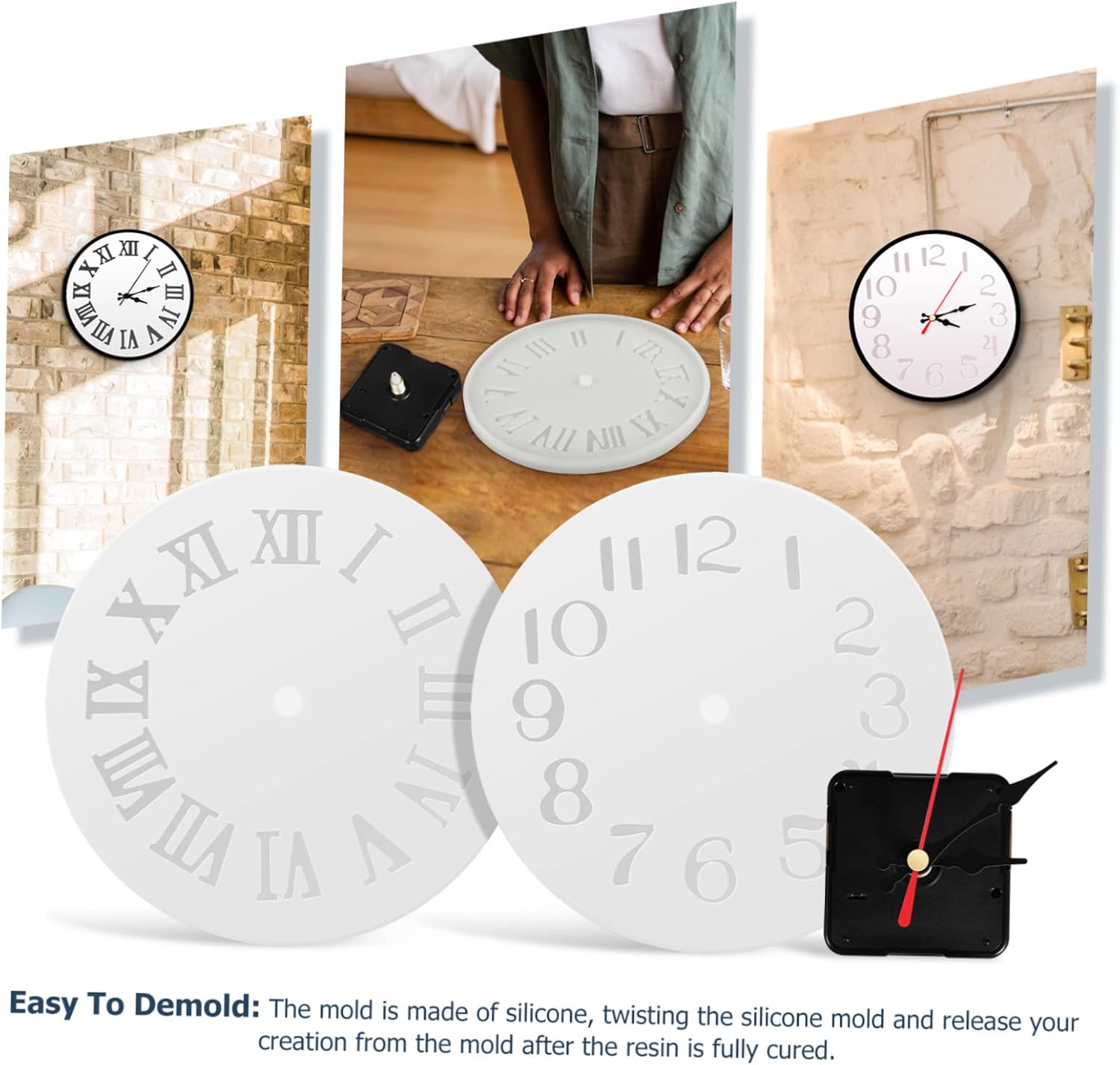Package List 2 x molds 2 x shafts movements 2 x iron hooks 2 sets x pointers 2 x second points Features -DIY Craft: You can add beads, sequins, colors, dried flowers to the mold to create a unique clock for wall decoration clock hands and motor kit. -Material:Aluminum, silicone clock molds for resin -Funny for DIY: You can complete the DIY process with your family or friends, exercise your hands-on ability, and enrich your spare time clock movement. -Color:As Shown DIY clock kit -Unique : details and good use experience. This is a great make meaningful your friends and family resin clock mold kit. -Durability And Practicality: This simple clock movement is exquisitely crafted, sturdy and durable, with clock mechanism kit. -Size:15.50X15.50X0.80cm/6.09X6.09X0.31in clock works replacement kit -DIY Clock Repair Kit: You will get the shaft clock movements with clock hands, and clock silicone resin moulds, these suit well to make a clock clock replacement mechanism.Goods Descriptionclock motor This wall clock mechanism and hands replacement kit has excellent texture and durability, so it can serve you for long time.clock kits for do it yourself And comes with resin clock mold kit, creating your own crafts, creating a unique clock for wall decoration