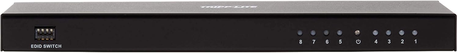 Hdmi splitter transmits 4K video + audio to 8 HDMI displays at the same time Recommended for home theaters or short-distance digital signage applications in classrooms, showrooms, offices, churches, restaurants, bars, hotels and trade shows, this ultra high definition (UHD) HDMI splitter is quick and easy to install. It connects to an HDMI source device, such as a computer or Blu-ray player, and transmits a 4K audio/video signal to eight HDMI monitors, Projectors or Televisions simultaneously. You can cascade up to three levels of splitters, which expands the total number of connected displays to 512. Supports UHD 4K x 2K signals up to 15 ft. Via HDMI cabling using standard 28 AWG HDMI cable, The b118-008e-uhd-2 distributes a 4K x 2K audio/video signal (at 60 Hz) up to 15 feet (4 meters). be sure the HDMI cables connecting the splitter to the source and displays are no longer than 15 feet. For best performance, we recommend using Tripp Liter's p569-series premium high-speed HDMI cables. Supports up-to-date features and formats The b118-008e-uhd-2 supports a wide range of audio formats, including DTS-HD, Dolby TrueHD, Dolby digital Plus and LP's 7.Channel surround sound. It also features Lip Sync pass-through, 36-bit Deep Color, xvYCC and X.Vcolor, while receiving and transmitting up to 18 Gbps of bandwidth with no data loss. To ensure compatibility with the latest hardware, This splitter is compliant with HDCP 2.2, 3D and HDMI 2.0 standards. User-adjustable EDID settings gives you control over a/V resolutions EDID (extended display identification data) allows the source device to identify the capabilities of each connected display and transmit to the highest video and audio resolutions shared by all displays. The b118-008e-uhd-2’s default EDID setting uses the lowest level of video format shared by the displays (for instance, if two monitors support 4K video and one supports 1080p, all three monitors will show 1080p). in the event you want to Override the automatic detection setting and control the audio/video output yourself, you may do so by adjusting the built-in dip switches. Ready to use right out of the package The plug-and-play b118-008e-uhd-2 requires no additional software or drivers. Connect your devices to the HDMI ports with user-supplied HDMI cables (such as Tripp Liter's p569-series), and plug the included external power supply into an AC power source to get started. An amber LED indicates the unit is receiving power, and blue LEDs indicate connected HDMI inputs. Use the included hardware to install the unit on a desktop or mount it to a wall.