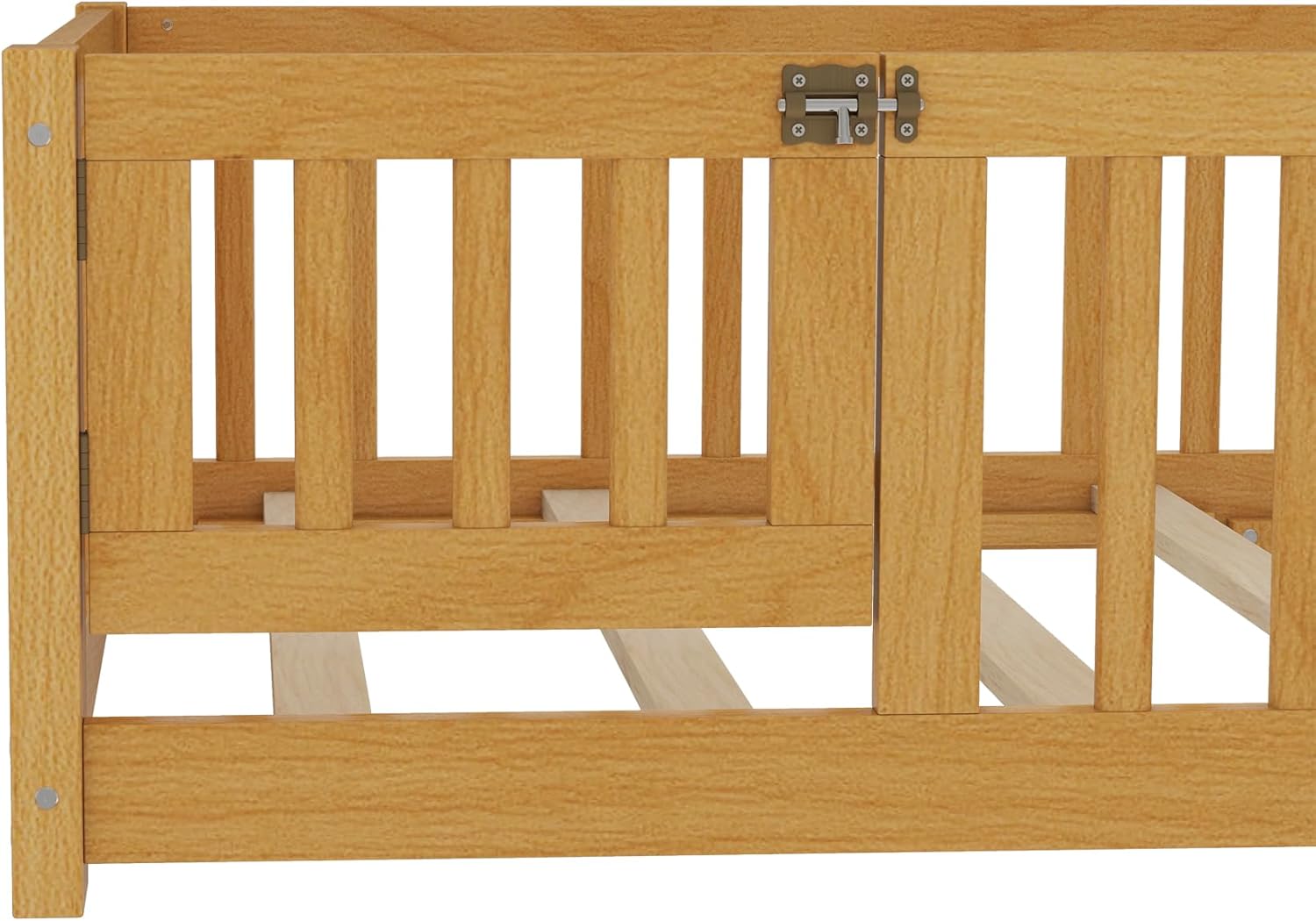 This Twin size kids floor bed features safety guardrails and a functional door, creating a secure and engaging Montessori-inspired sleep space for toddlers. Crafted from high-quality pine and plywood with a natural wood finish, its low-profile design sits close to the floor for safe independent access and exploration. The removable door adds playful interest and can be taken off as needed. The optional slats lift the mattress for cleanliness or can be removed to convert the area into a playroom. With eight supportive slats ensuring stability, it helps transition children from co-sleeping to independent sleeping. Assembly is straightforward. Overall dimensions are 77.5"L x 40.7"W x 17.5"H, with a weight capacity of 350 lbs. No box spring is required, and the recommended mattress thickness is 4-6 inches.