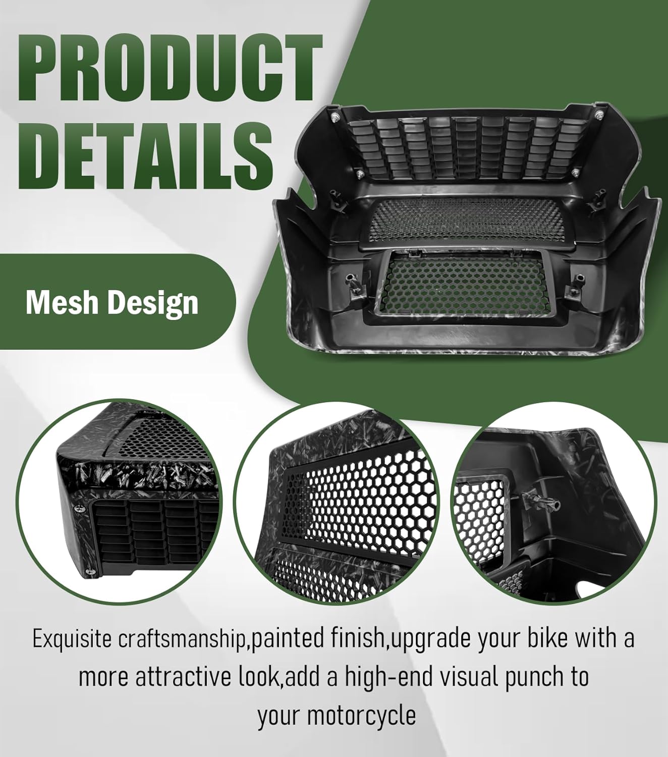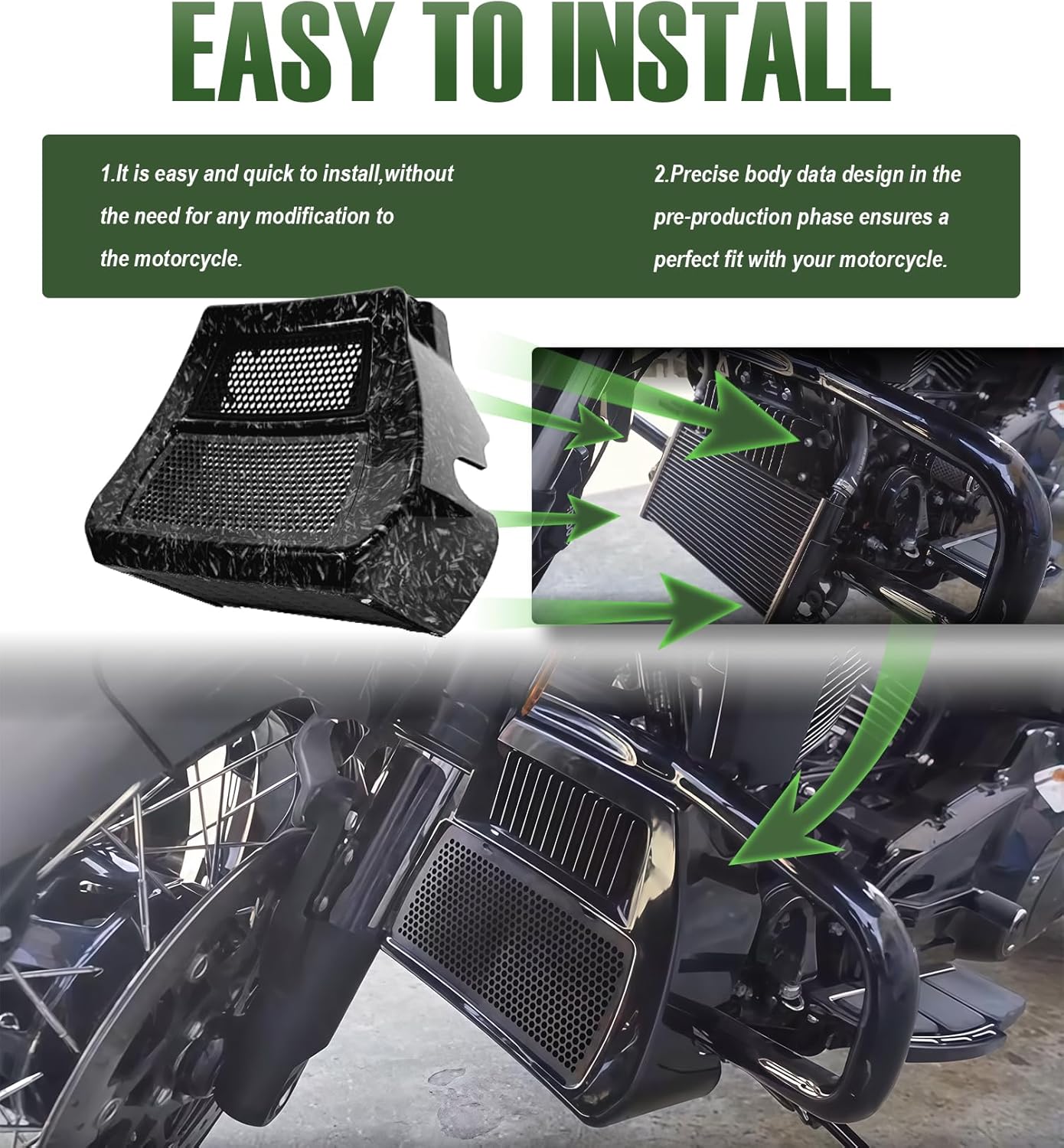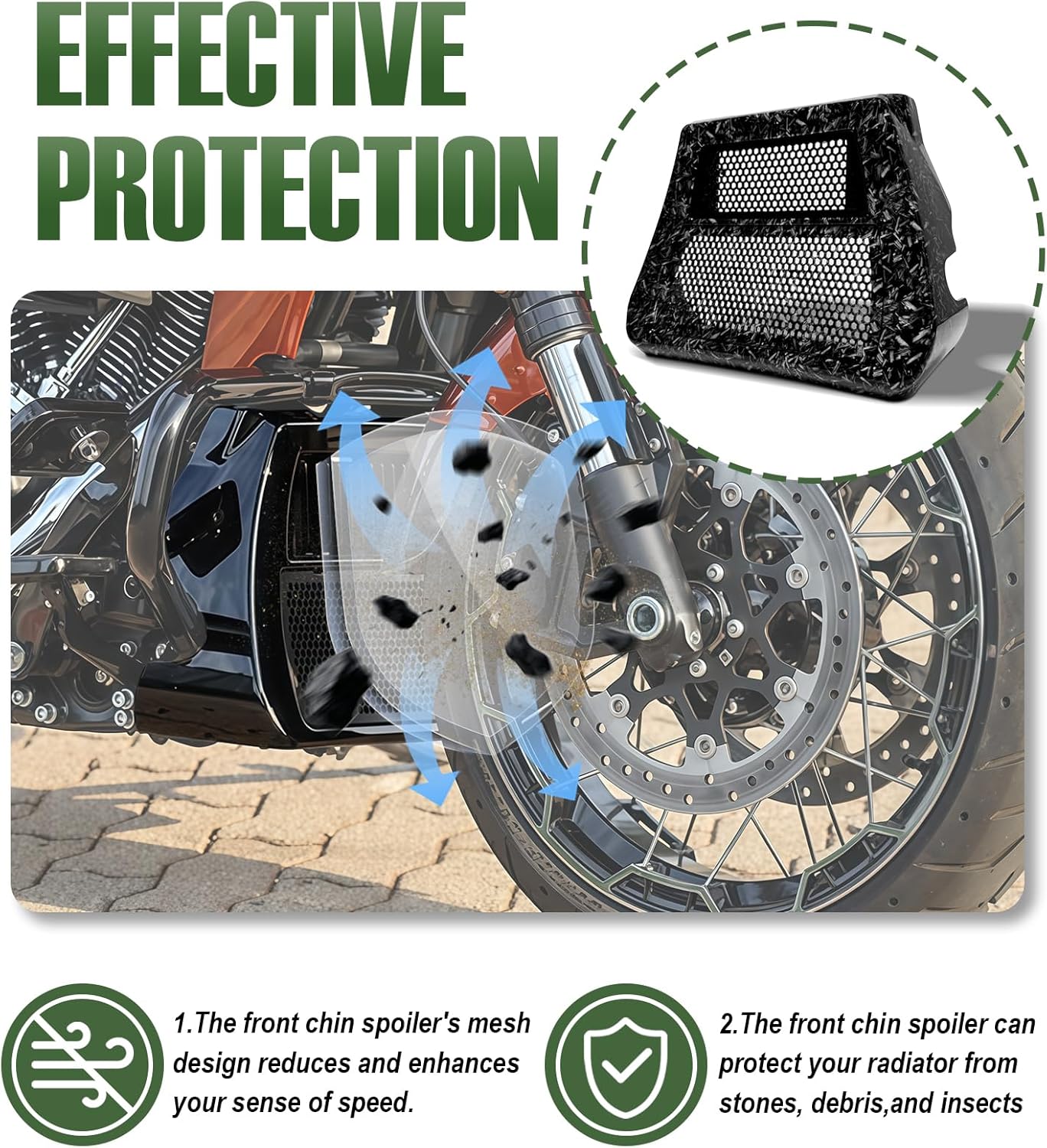 This Upgraded Chin Spoiler fits for CVO Street Glide 2023.5-2026,CVO Road Glide 2023.5-2026,Street Glide and Road Glide 2024-later,(Except 2025-later Street Glide Ultra with OEM Lower Fairing).Also Compatible with Harley OEM Flat Out Crash Bar.