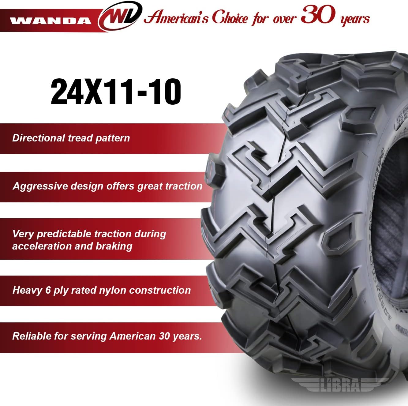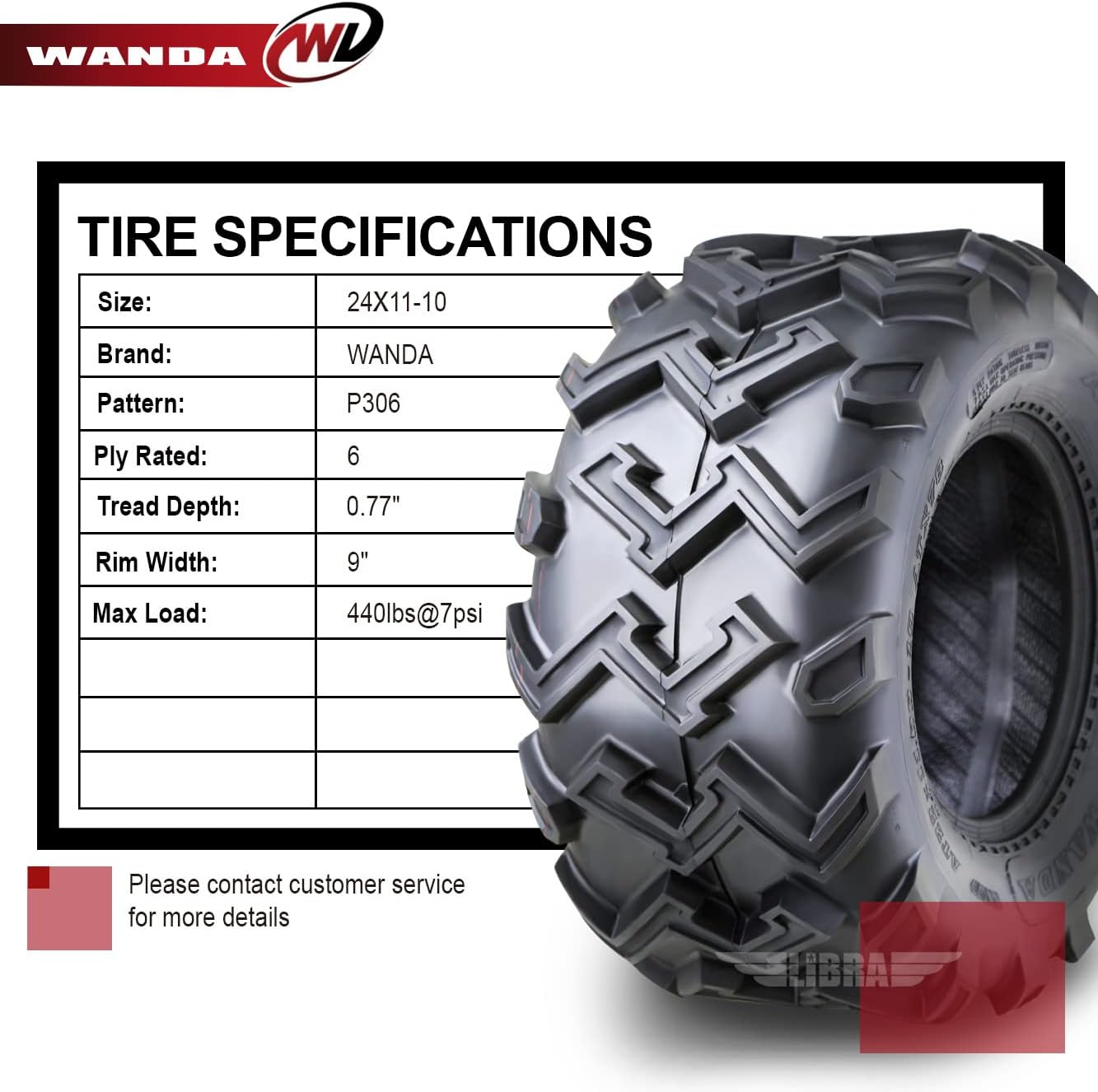 Tire SpecificationsTireSize: 24x11-10Brand: WANDAPattern: P306Ply Rated: 6Tread Depth: 0.77"Rim Width: 9"Max Load: 440lbs@7psi