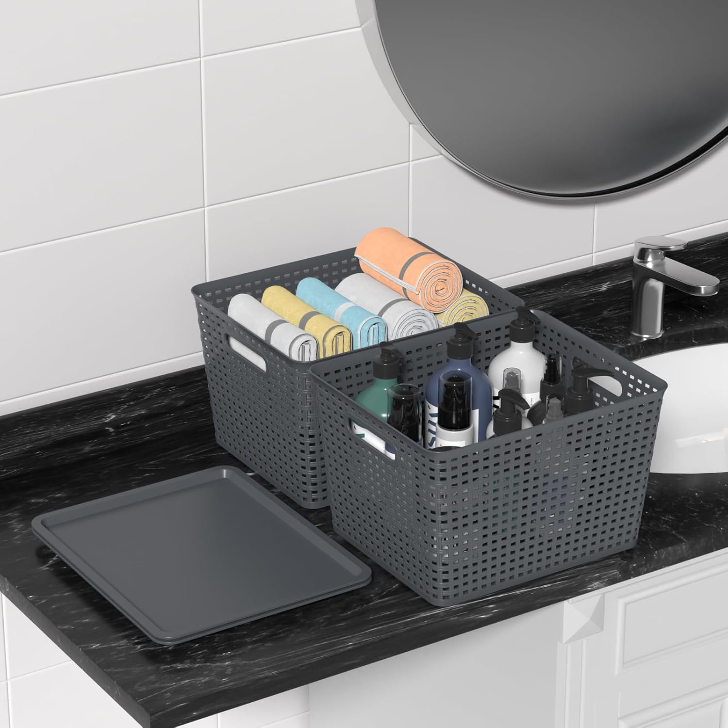 6-Pack Large Plastic Weave Storage Basket with Lid, Grey