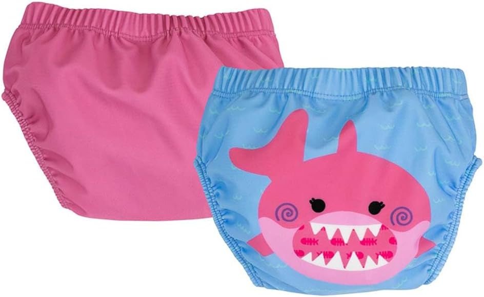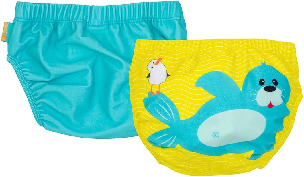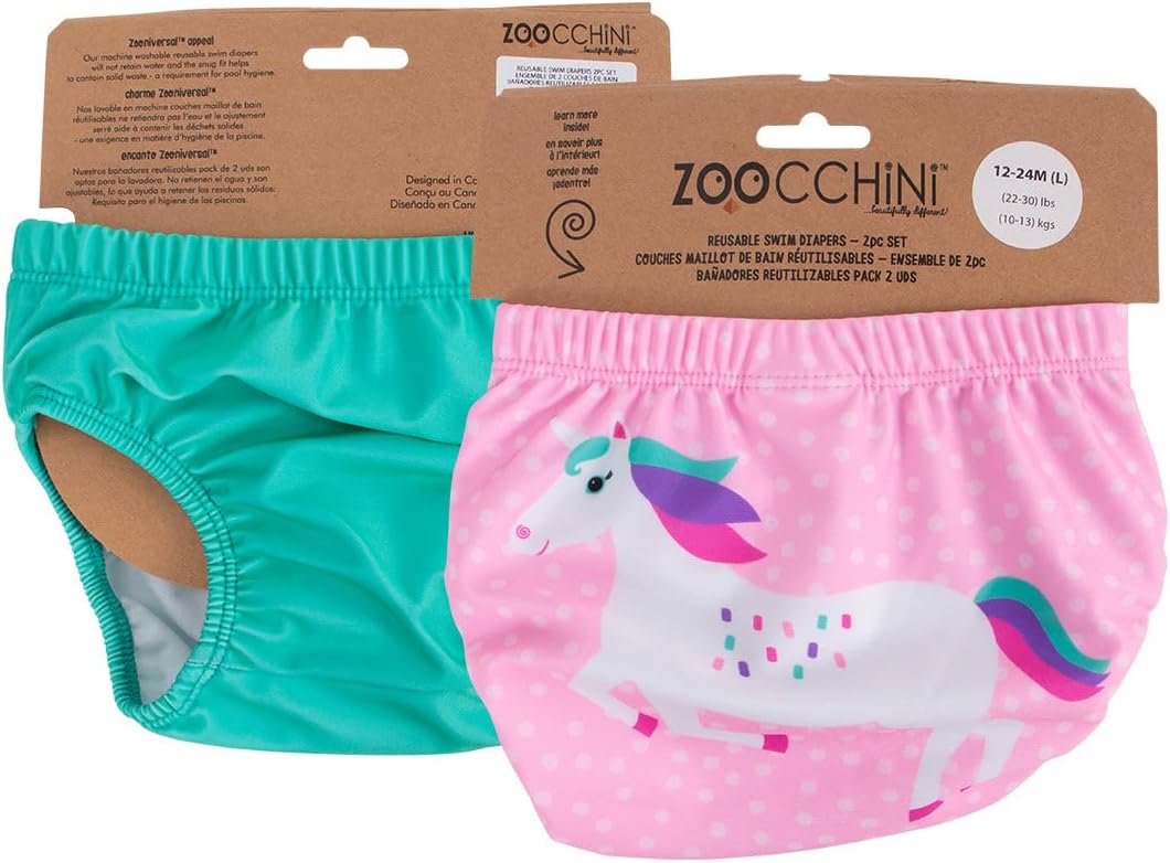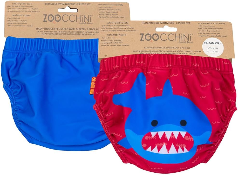 Your little one will look oh-so-cute taking a dip in the ocean or the pool, and your baby's swim will also be pool-friendly! ZOOCCHINI's worry-free Reusable, Waterproof Swim Diapers for your baby have UPF sun protection and are easily washable for simple care and maintenance. Our Reusable Waterproof Swim Diapers are lined with comfortable, soft mesh liner, and has an adjustable waist, tied to ensure a snug but comfortable fit. Unlike regular diapers, our Swim Diapers are designed to contain solid waste, which is mandatory for public pool safety. Designed for year-round use in swim schools, pools, spas, waterparks, amusement parks, resorts, beach Chlorine and Salt Water resistant fabric means prints and colors that stay bright through multiple uses. Reusable, Eco-friendly: Splash again and again. Designed to be washable and reusable giving you the confidence your child will have no accidental leaks. Disposable swim diapers are not very efficient at containing accidents. If you are teaching your infant survival swimming skills required to safely enjoy the water at a swim school, ZOOCCHINI's Reusable, Waterproof Swim Diaper is a must. Make good choices and stay safe in the sun. UPF50+ clothing helps protect against sun, but sunscreen should be applied to any skin that is not covered by a sun protective garment (face, ears, hands, etc.) Age 6-12M: 15-22lbs | Waist 7.25"-10" extended Age 12-24M: 22-30lbs | Waist 8"-11" extended Age 24-36M: 30-36lbs | Waist 8.75"-12" extended Designed to be worn alone without need for a diaper. If using over a bathing suit or a diaper, please consider the next size up. Package Includes: Reusable Knit Swim Diaper 2-Pc Set Designed in the USA